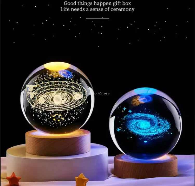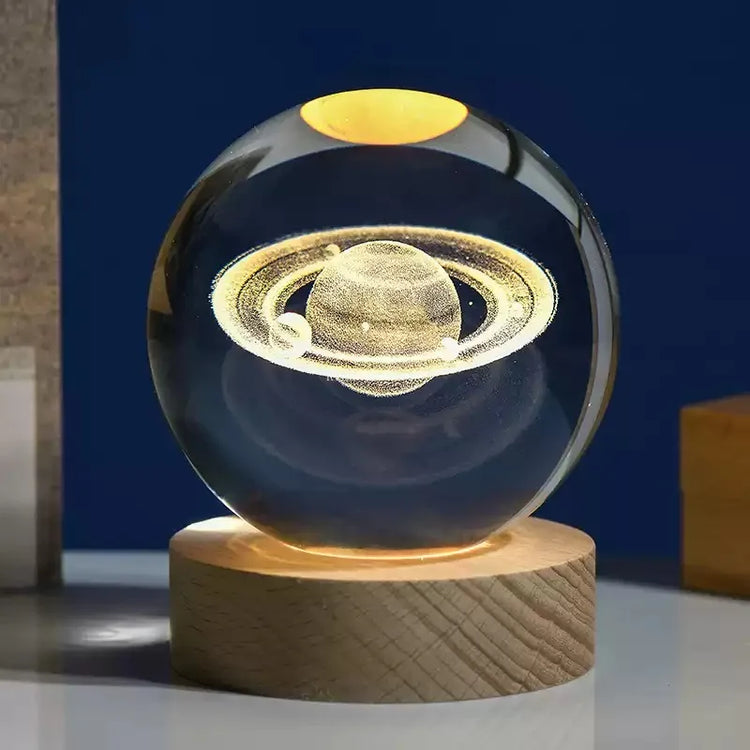 This decorative night light features a sleek, spherical design mounted on a sturdy wooden base, emitting a warm, ambient glow. The light creates a mesmerizing effect with its internal display, perfect for adding a celestial touch to any room. Ideal for bedrooms or nurseries, it operates quietly and is powered by a USB connection, offering portability and ease of use. The soft illumination enhances the atmosphere, making it a charming addition to your decor.